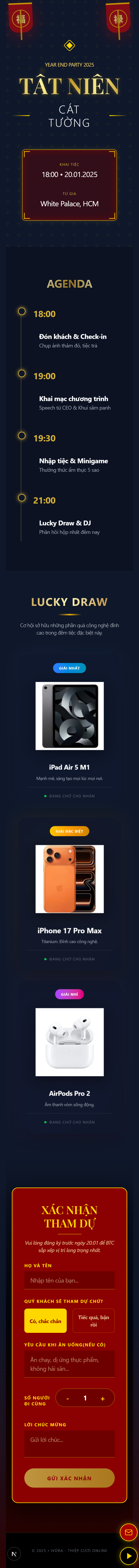 1. Phối màu và Đồ họa Tông màu chủ đạo: Sự kết hợp giữa màu xanh đen sâu thẳm (midnight blue) và đỏ đô (burgundy) tạo nên một nền tảng vững chãi và đẳng cấp. Các chi tiết chữ và biểu tượng được phủ sắc vàng đồng (gold) giả kim loại, tạo độ tương phản cao và mang đậm không khí lễ hội cuối năm. Họa tiết: Nền thiệp sử dụng các chấm lưới nhỏ và hiệu ứng ánh sáng mờ ảo, giúp không gian thiệp có chiều sâu như một sân khấu sự kiện thực thụ. Hai chiếc lồng đèn cách điệu ở góc trên cùng tạo điểm nhấn văn hóa truyền thống tinh tế cho tiệc Tất niên. 2. Cấu trúc và Trải nghiệm người dùng Dòng chảy thông tin: Thiệp được dẫn dắt theo một trình tự logic từ "Lý do" (Tiệc Tất niên) -> "Thời gian, Địa điểm" -> "Lịch trình chi tiết" -> "Sức hấp dẫn" (Quà tặng) và kết thúc bằng "Hành động" (Xác nhận tham dự). Hình ảnh trực quan: Việc sử dụng hình ảnh thực tế của các sản phẩm công nghệ (iPhone, iPad, AirPods) ở giữa thiệp đóng vai trò là "điểm chạm thị giác", kích thích sự hào hứng và tò mò của người nhận ngay trước khi họ đến phần đăng ký. 3. Phong cách giao tiếp Trang trọng nhưng gần gũi: Cách trình bày rõ ràng với các biểu tượng đồng hồ cho lịch trình và nút bấm xác nhận trực quan giúp người xem dễ dàng nắm bắt kịch bản chương trình. Tính tương tác cao: Điểm đặc biệt của tấm thiệp này là phần Form xác nhận tích hợp ở cuối. Nó không chỉ là một tờ thông báo một chiều mà là một công cụ tương tác chuyên nghiệp, giúp đơn vị tổ chức quản lý danh sách khách mời một cách công nghệ và tiện lợi.