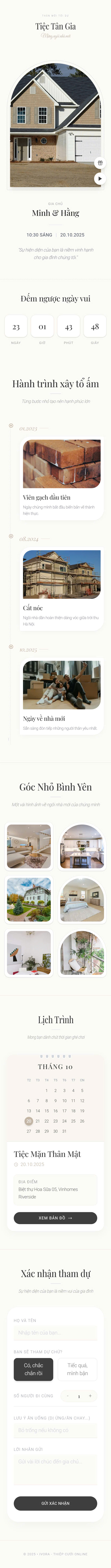 Thiệp mang tông kem – be nhẹ, tạo cảm giác tinh tế, ấm áp và rất “homey”. Bố cục dọc, tối ưu cho điện thoại, đọc mạch lạc như một câu chuyện. Phần đầu - Tiêu đề trang nhã, font chữ mảnh, thanh lịch. Ảnh đại diện dạng khung bo tròn là hình ngôi nhà – biểu trưng cho tổ ấm và khởi đầu mới. Tên cô dâu – chú rể được đặt gọn gàng, dễ đọc. - Đếm ngược ngày vui Khối countdown rõ ràng (ngày – giờ – phút – giây), tạo cảm giác háo hức và giúp khách mời nhớ chính xác thời điểm. - Hành trình xây tổ ấm Các mốc nội dung được trình bày như nhật ký: viên gạch đầu tiên, căn nhà, khoảnh khắc đời thường… mỗi mục có ảnh minh họa và mô tả ngắn, rất gần gũi. - Góc nhỏ bình yên Thư viện ảnh dạng lưới bo tròn, ánh sáng tự nhiên, tông màu đồng nhất – mang lại cảm giác thư giãn, đời sống gia đình ấm cúng. - Lịch trình & tiệc mừng Phần lịch trình rõ ràng theo tháng/ngày. Thông tin tiệc được đặt trong thẻ bo góc, nổi bật nút hành động. - Xác nhận tham dự (RSVP) Form gọn gàng, dễ thao tác, giúp khách mời phản hồi nhanh chóng.